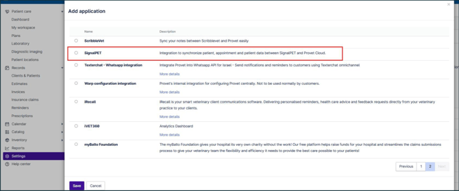 Enabling the SignalPET integration takes just a few clicks (screenshots from Provet below):