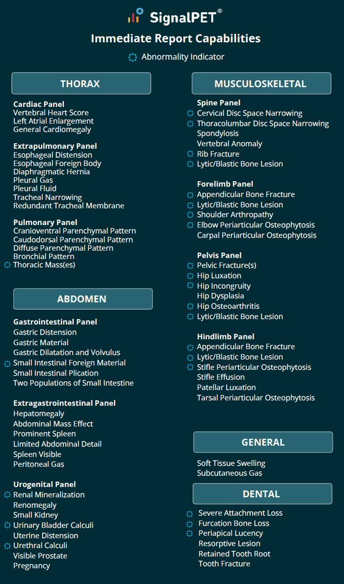 Similar to how laboratory equipment evaluates specific parameters in a blood work panel (like a Chem 22) and returns normal or abnormal results, the Immediate Report utilizes AI to assess radiographs for specific findings. The Immediate Report acts as a second set of eyes on every case, aiding triage and diagnosis by quickly flagging key radiographic signs such as obstructions, fractures, effusions, bone loss, and cardiomegaly.